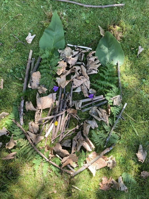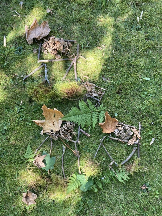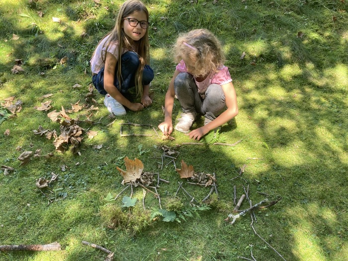 Krásné počasí přímo vybízelo jít ven, proto jsme se rozhodli strávit výtvarnou výchovu v přírodě v okolí školy. Úkolem dětí bylo tvořit obrazy z přírodních materiálů. Jednalo se o skupinovou práci a tvoření podle fantazie.
