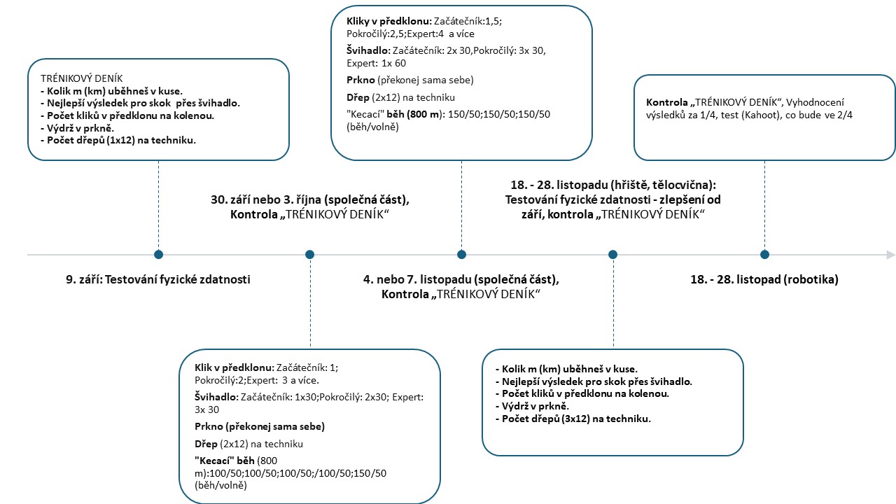 Níže najdete termíny pro říjen a listopad, kdy proběhne společné testování vaší fyzické zdatnosti. Obrázek ukazuje minimální výkony z 5 cviků, které můžete trénovat doma, pokud to půjde.