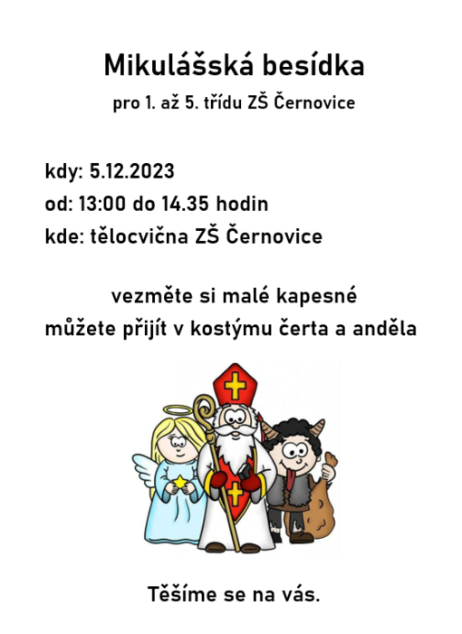 9. třída zve žáky 1. stupně na tradiční mikulášskou besídku, která se bude konat 5. prosince od 13,00 do 14,35 hodin v tělocvičně základní školy.