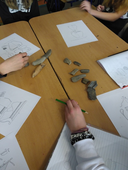 Následující hodinu jsme se ještě seznámili s keramikou, ve které se ve středověku jídlo vařilo a podávalo. Z keramických střepů jsme rekonstruovali středověké hrnce, pokličky, mísy a džbány.