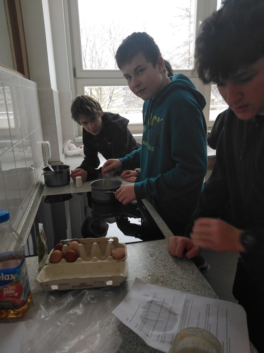 Jak vypadala středověká kuchyně si v minulých hodinách dějepisu vyzkoušeli žáci 7. třídy. Rozdělení do dvou skupin si vybrali z několika receptů z konce středověku, přinesli si suroviny a jídlo uvařili ve cvičné kuchyni. A protože se obě skupiny rozhodly pro jednoduchou jablečnou kaši, dostala ještě každá bedýnku s neznámými surovinami. Z těch nakonec uvařili výbornou jáhlovovou kaši s jahodami a pohanku na slanině a česneku.