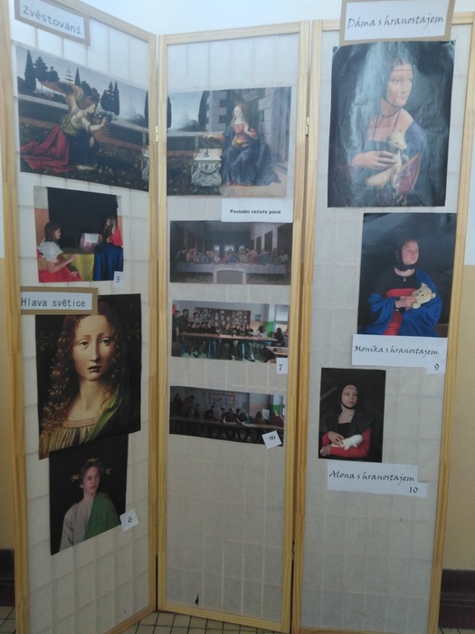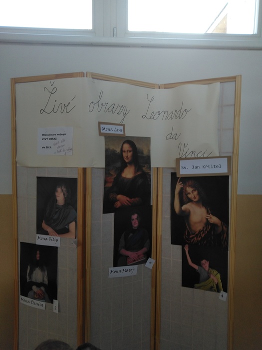 V březnu probíhala na 2. stupni soutěž živých obrazů od Leonarda da Vinci. Soutěžící se snažili napodobit slavná díla, vyfotili se a všichni žáci poté hlasovali pro nejvěrnější kopii. Na prvních dvou místech se umístila Mona Lisa, třetí místo obsadila Hlava světice. Všem účastníkům děkujeme a výhercům gratulujeme.